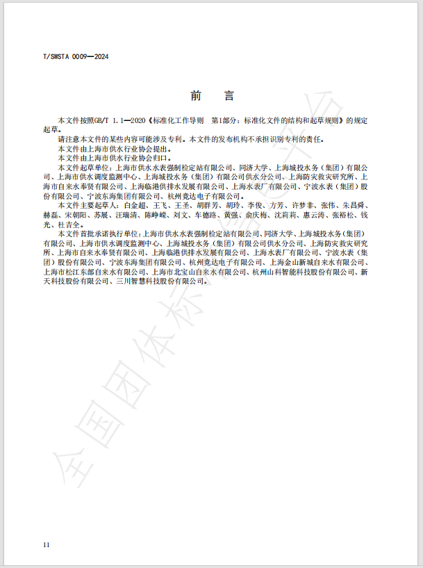 本標(biāo)準(zhǔn)由上海市供水水表強制檢定站有限公司、同濟大學(xué)及上海城投水務(wù)(集團)有限公司牽頭組織上海市供水調(diào)度監(jiān)測中心、上海防災(zāi)救災(zāi)研究所、杭州競達電子有限公司等參編單位共同編制,對做好城市供水安全管理,消除城市運行安全隱患,強化重大安全風(fēng)險管控,確保城市安全運行、社會安全有序,具有重要意義。